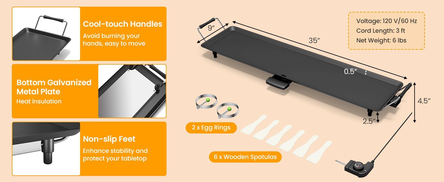 La superficie de 35 x 9 pulgadas te permite cocinar una variedad de comidas